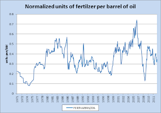 Not much to choose between them, if you ask me. The point here is that virtually all commodities exhibit some kind of long-term mean relationship with oil. Indeed the increasing linkage between energy and non-energy goods was a driving factor in the commodities boom of recent years. Now, of course, scale matters here and it might be misleading just to eyeball separate charts. As one last treat then, here is a single chart containing the above commodities plus a few extra, normalized in terms of their respective units. (I pick 2002 = 1 for no better reason than this is the year that Chris used in his initial post.) Again, I think the message is pretty clear.