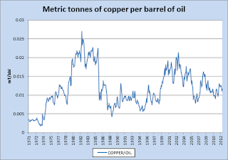 Anyway, to illustrate here is the price of gold per per barrel of oil since 1971, followed by the same for several commodities. These series were picked more or less at random and are taken from the World Bank's Data Centre. (Click to enlarge.)