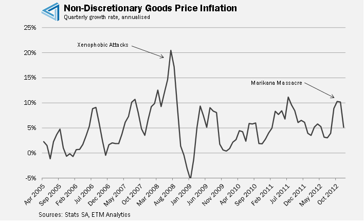 Again, however, this seems to be a misunderstanding of what I have written and the major point of my post. In the passage that he quotes, I'm not concerned with alternative causes of violence, but rather the underlying drivers of one particular cause, i.e. inflation. At the risk of repeating myself: To the extent that inflation does act as a trigger for social unrest and violence – and irrespective of whether that occurs alongside other factors such as political grievances or not – we need to understand what the underlying forces behind that inflation are. Any analysis that focuses only on the nominal effects of (quote unquote) “delinquent” monetary policy is simply misleading. Why? Well, because there may be very significant real price drivers occurring at the same time! This is something that the Business Day article completely failed to mention, and the same is true for The Telegraph article that I quoted in the second half of my post. I see nothing wrong with taking exception to such slipshod analysis.